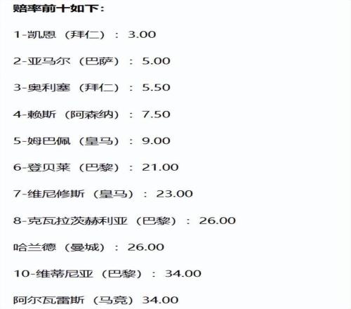 随着五大联赛和欧冠赛事进入最后的冲刺阶段,最新一期的金球奖赔率排行榜也顺势出炉,来自的拜仁的老年射手凯恩目前位居榜首,而大热门姆巴佩却无缘前三。巴萨球星亚马尔虽然位居第二,但却遭到球迷的疯狂吐槽。